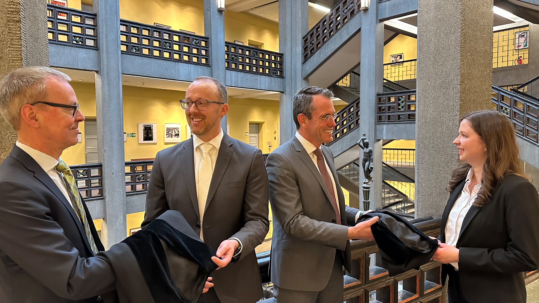 Die Fotos zeigen die symbolische Übergabe der Rechtspflegerroben durch den Staatsrat, Herrn Dr. Schatz, und den Präsidenten des Amtsgerichts Hamburg, Herrn Dr. Christensen an den Landesvorsitzenden des BDR Hamburg, Dipl. Rpfl. Sören Georg Sauer, den Kolleginnen Dipl. Rpflìn Laura Gehre und Dipl.Rpflìn Nicole Soujon und den Kollegen und Projektleiter Dipl.Rpfl. Volker Herbert Laedtke.